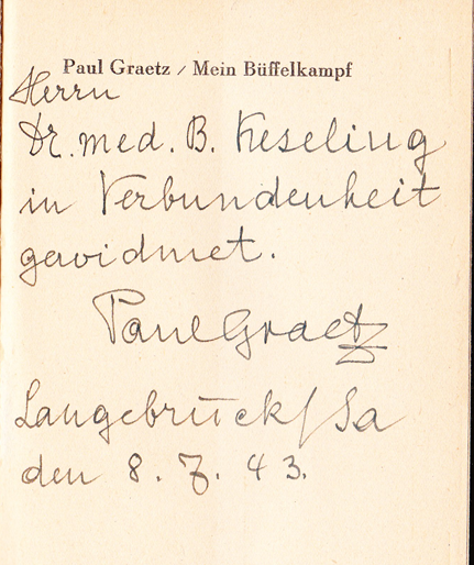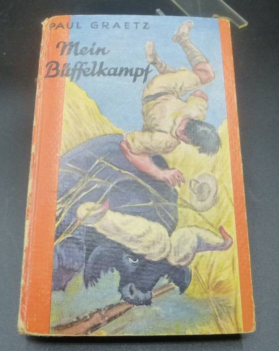 Graetz, Paul: Mein Büffelkampf. Abenteuer in Afrika. Karl Siegismund Verlag, Berlin Softcover + Hardcover Ausgaben 1 Auflage 1939, 2. Auflage 1941 Auflage wegen Papierknappheit nur 6000 Exemplare