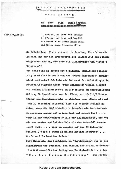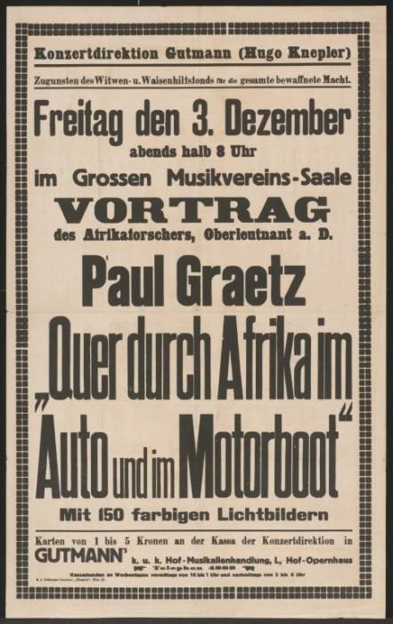 Natürlich wollte Graetz auch noch mit seinen Dia-Vorträgen und seinem auf das neue 32mm Format umkopierten Sarotti - Expeditionsfilm von der Motorboottour autark auf "Tournee" gehen und seine Rente aufbessern.