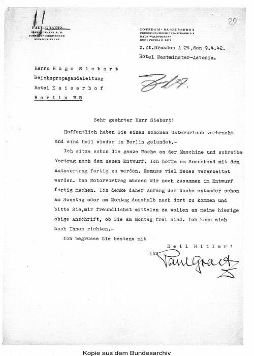 Graetz hat in dieser Zeit - wie auch schon in den zwanziger Jahren - häufig im Alten Hotel Adlon (das Zimmer am Aufgang neben dem Speisesaal ) und auch im Hotel Fürstenhof gewohnt.